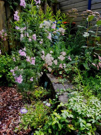Een roze wolk, 1 lijkt op ridderspoor (is het niet), daarachter, naam even kwijt, en daar weer achter komt de ..... in knop.